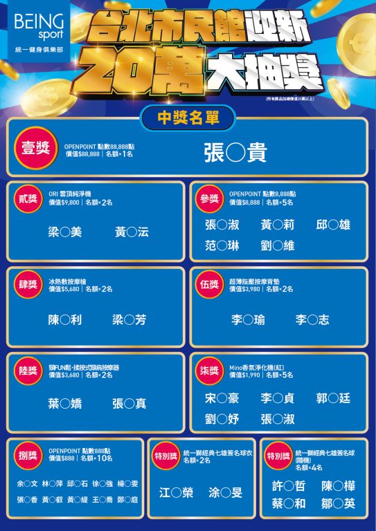 ※領獎時需具備BEING sport有效會員資格,如活動期間或領獎時已申請解約者,視同放棄領獎資格。