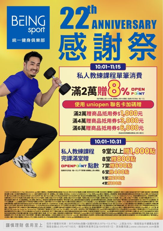 🎉 BEING sport 22週年感謝祭開跑! 🎉 💪 私人教練課程🏷 單筆消費滿2萬元,贈8%OPENPOINT點數💳 用uniopen 聯名卡,最高再送6000元商品抵用券|教練課優惠|