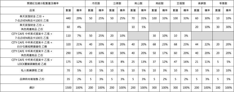 - 全館別分配開運紅包之獎項及數量、中獎機率如下表格所示,開運紅包獎項及數量,依各館別實際庫存為準,抽完為止