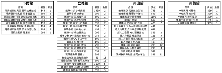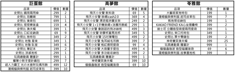 獎項小卡如包含角色周邊商品, 該品項依獎項小卡背面記載為準 ; 現場將會公告角色周邊商品之所有品項及剩餘數量,抽獎獎項將依各館現場即時庫存為準 ; 全館別角色周邊商品之分配數量及品項價值如下: